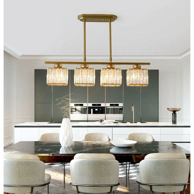 Dieser rechteckige Kronleuchter kombiniert eine klare Linienführung mit transparenten Glas-Elementen. Die längliche Form sorgt für eine gleichmäßige Ausleuchtung über Tisch oder Arbeitsfläche und unterstützt eine ruhige Raumwirkung.